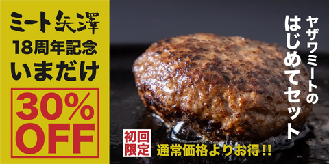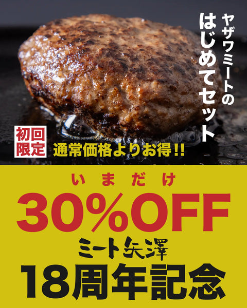 弊社直営店「ミート矢澤 五反田本店」の18周年を記念して、ヤザワミートオンラインをご利用のお客様向けに、大人気商品を詰め合わせた「はじめてセット」をご用意いたしました。専用クーポンをご利用いただくことで、初回のみ30%OFFでご購入いただける商品です。